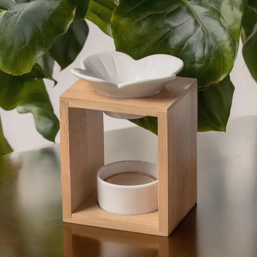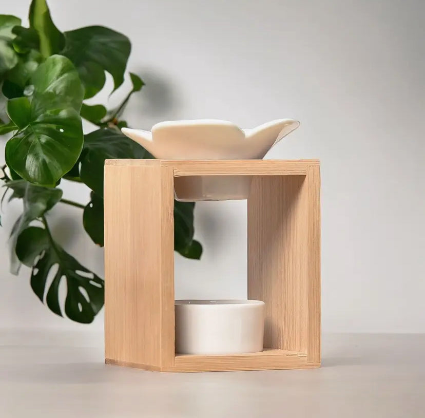 Sa coupelle en céramique accueille des cires parfumées, tandis que son socle en bambou ignifugé assure stabilité et sécurité à l’usage.